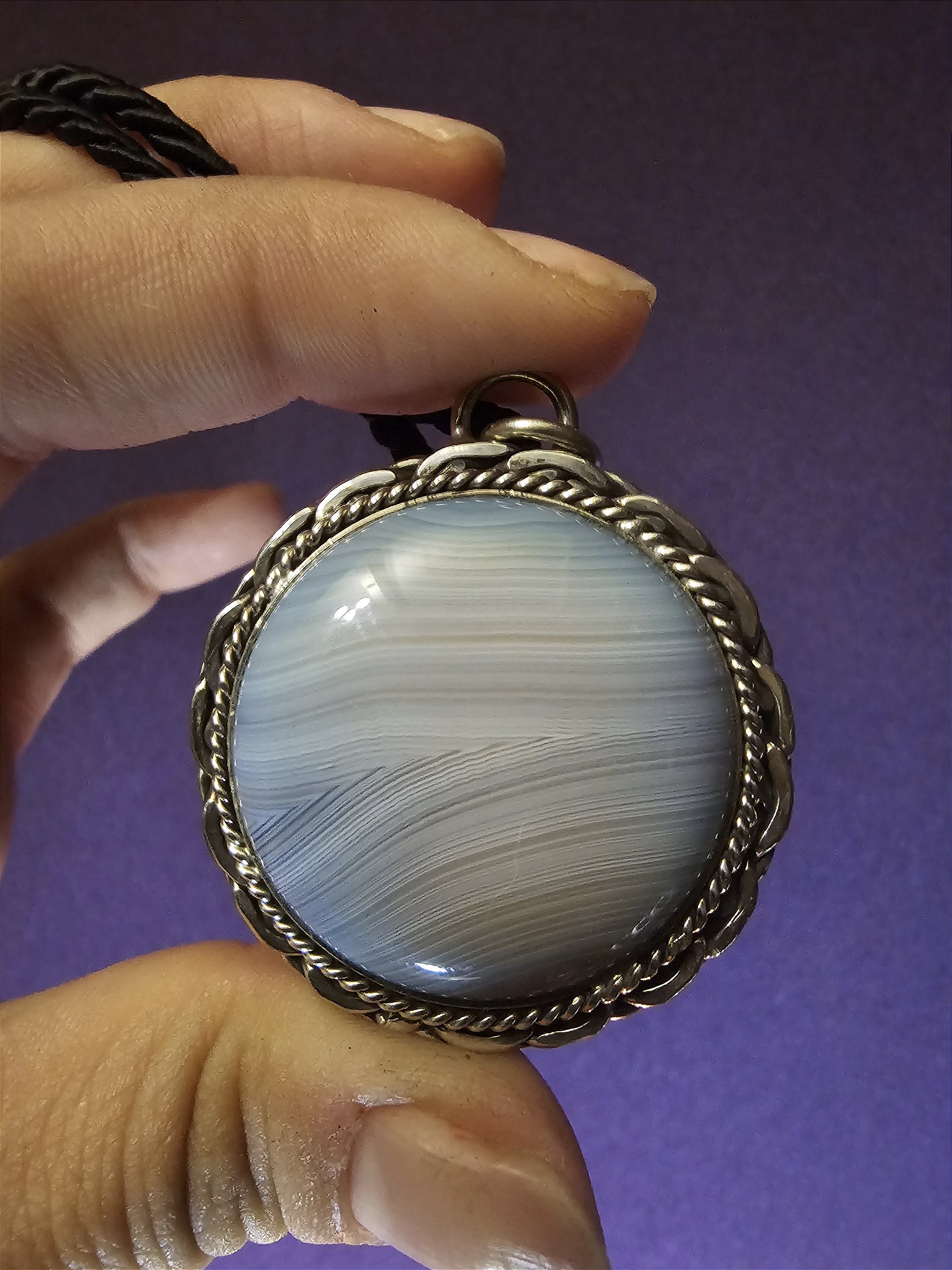 Pingente feito em prata alemã com Ágata, acompanha cordão preto de 50cm. PEÇA ÚNICA